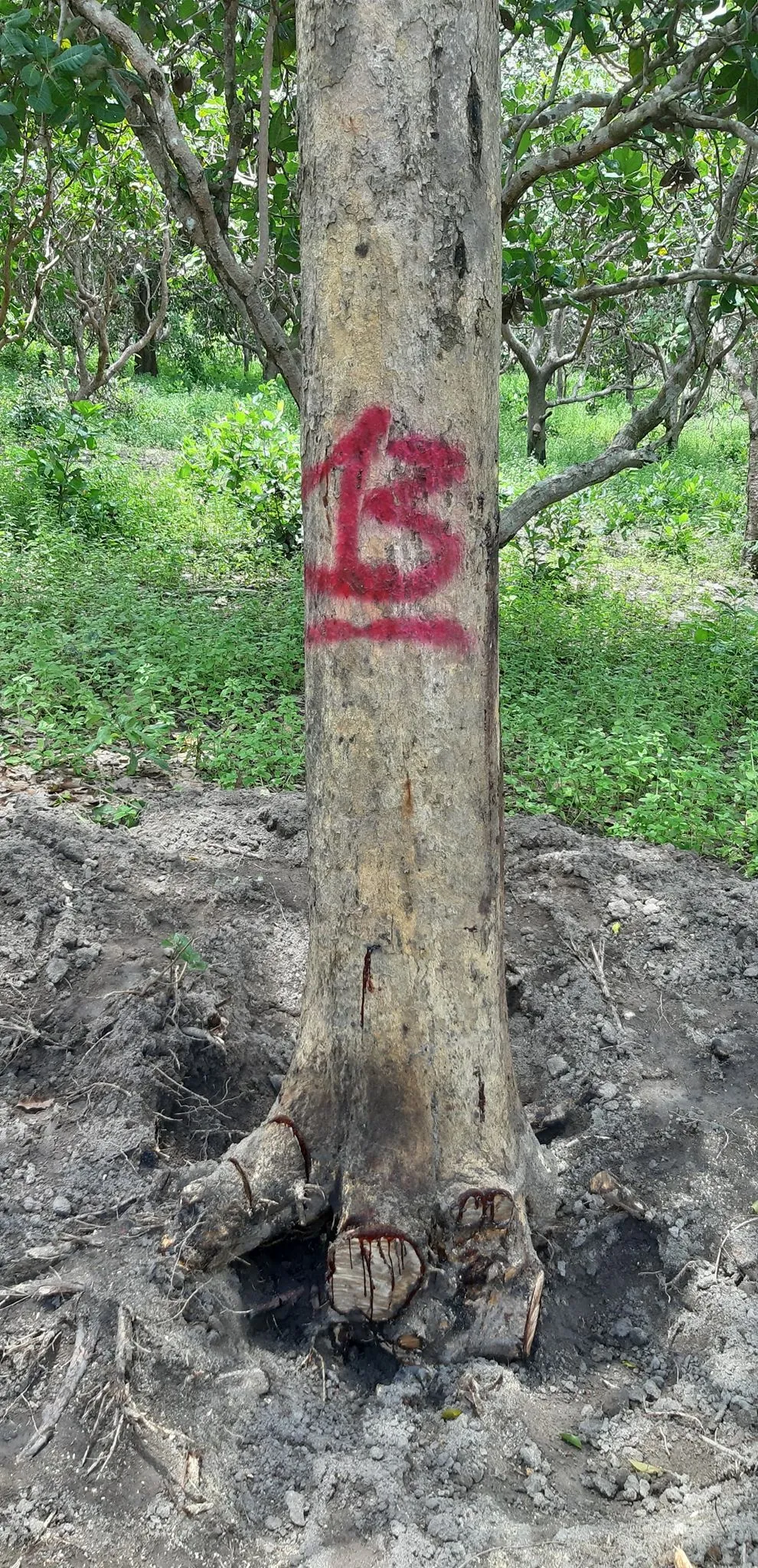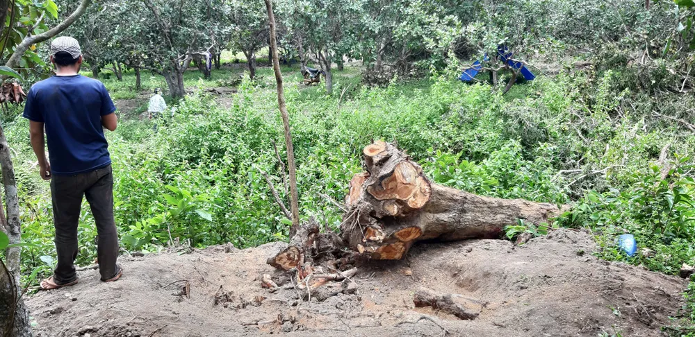 Bên cạnh đó, có nhiều cây gỗ khác mà đối tượng đã đào sâu xuống gốc nhưng chưa kịp triệt hạ. Nhiều cây gỗ Giáng Hương khác đã được đánh dấu đỏ và ghi số trên thân cây, nghi đã được người dân chốt giá bán nhưng chưa kịp khai thác.