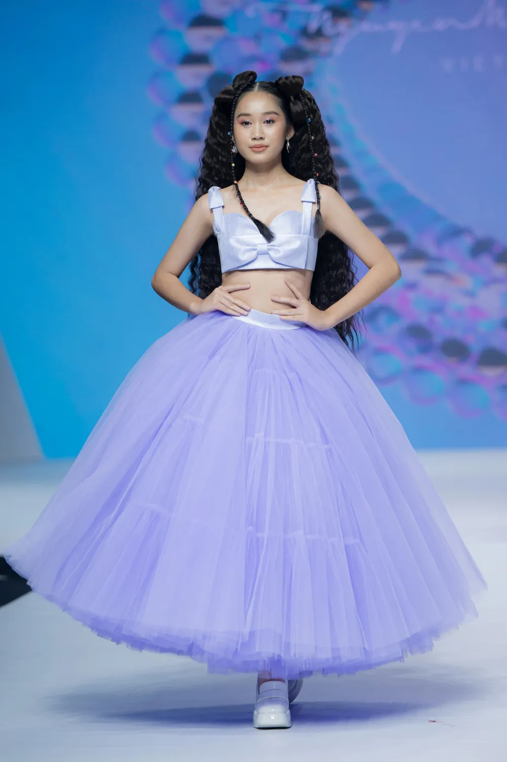 Tại sàn diễn Asian Kids Fashion Show 2023, màn chào sân của first face Bảo Hà – nàng thơ nhí của NTK Nguyễn Minh Công như nàng công chúa với trang phục mang tone màu tím mộng mơ cùng chân váy phồng xòe, đặc biệt là sự chú trọng trong việc tạo dựng sân khấu khi sử dụng sự hỗ trợ của dàn vũ công cùng đạo cụ là những chiếc bong bóng bay.