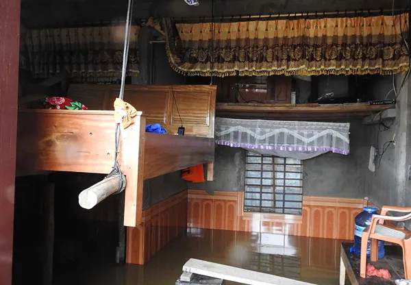 Người dân vùng lũ huyện Quảng Ninh kê giường lên cao vì lũ vẫn còn lên. Ảnh: Minh Phong