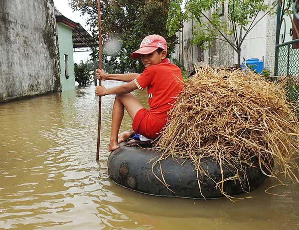 Trẻ em vùng rốn lũ thôn Hữu Tân, xã Tân Ninh, huyện Quảng Ninh, tỉnh Quảng Bình chèo phao hơi đi kiếm rơm khô. Ảnh: Minh Phong