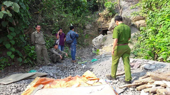 Tại hiện trường, một hầm rộng chừng 1m, cao 1,5m được đào sâu vào lòng núi; dụng cụ chỉ có một máy nổ, một máy quạt khí cùng nhiều vật dụng cá nhân còn vươn vãi.