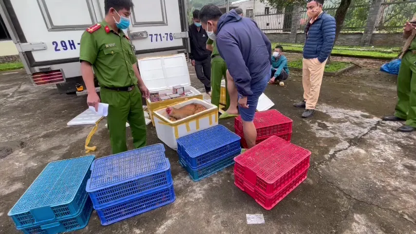 Qua kiểm tra phát hiện ôtô BKS 29H-771.76 do tài xế Nguyễn Hữu Sự (45 tuổi, trú huyện Lương Sơn, tỉnh Hòa Bình) và Lê Văn Phú (40 tuổi, trú huyện Lệ Thủy, Quảng Bình) điều khiển vận chuyển 2 thùng xốp chứa tổng cộng 64 hộp pháo, 1 thùng xốp chứa 3 cá thể mang, 4 cá thể chồn hương, 7 cá thể nhím.