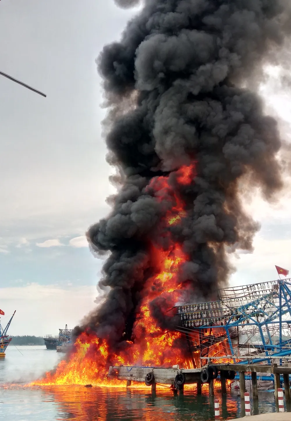 Tàu chụp mực NA-99389TS khi đang neo đậu tại cảng Kỳ Hà (thôn An Hải Đông, xã Tam Quang, Núi Thành, tỉnh Quảng Nam) thì bốc cháy dữ dội.