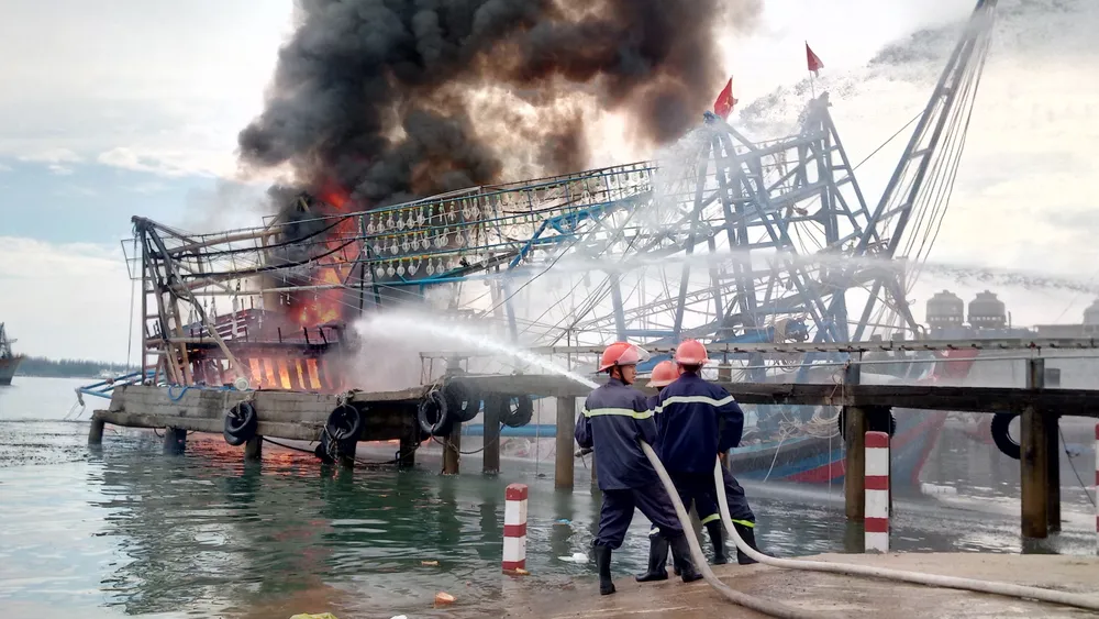 Lực lượng cứu hỏa đã điều động 5 xe cứu hỏa, cùng các lực lượng cảnh sát biển, bộ đội biên phòng và công an, dân quân tự vệ địa phương đến hiện trường dập lửa.