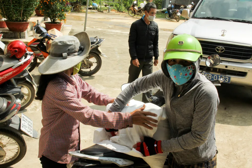 Phân phát hàng thiết yếu cho người dân tại xã Trà Thủy. Ảnh: NGUYỄN TRANG