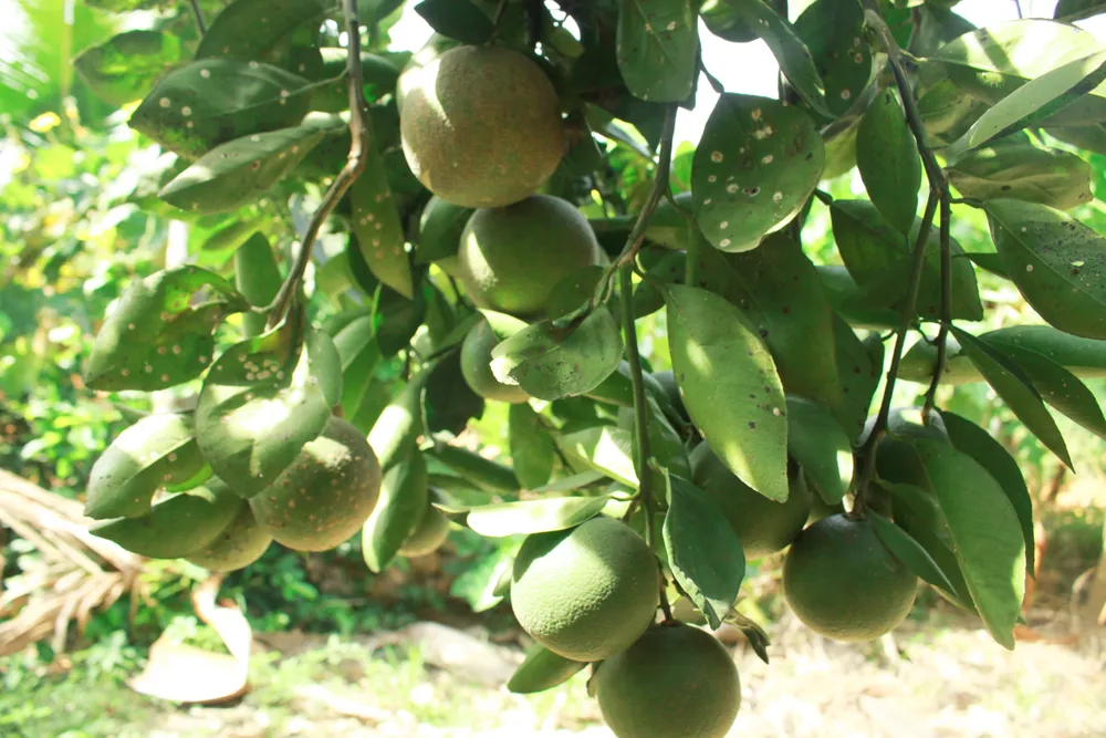 Tại nhà vườn của ông Phạm Đình Đạt (xã Hành Minh, huyện Nghĩa Hành) trồng nhiều chanh, cam, bưởi, quýt, sầu riêng, măng cụt, dừa dứa,… với diện tích 5.000m², hiện vườn ông đang bắt đầu thu hoạch cam, bưởi, mít.