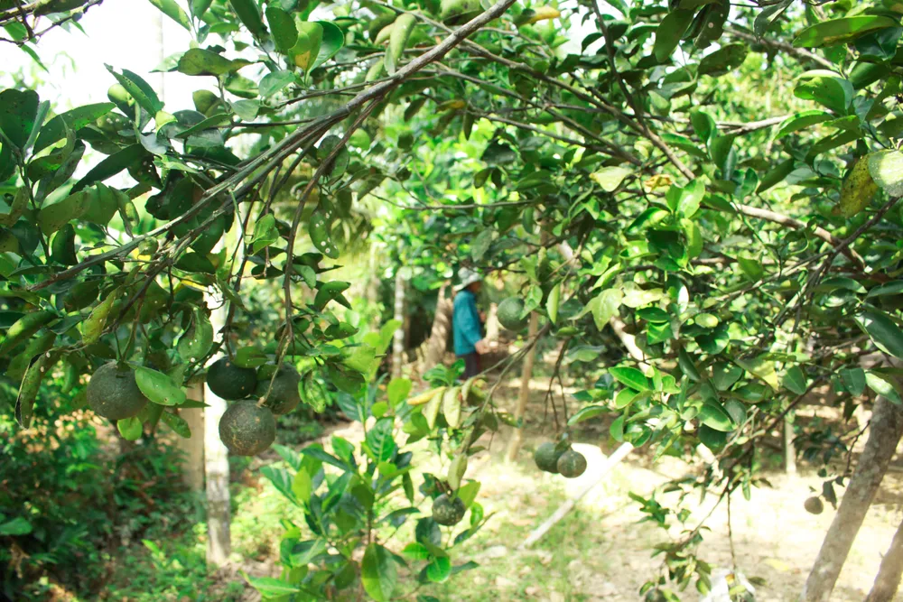 Vườn bưởi da xanh trĩu trái của ông Trịnh Văn Thế. Ảnh: NGUYỄN TRANG