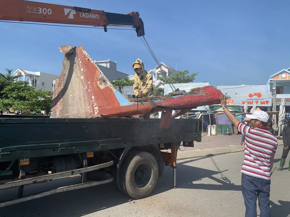 Xác tàu được cưa xẻ để đưa lên xe đến nơi xử lý |