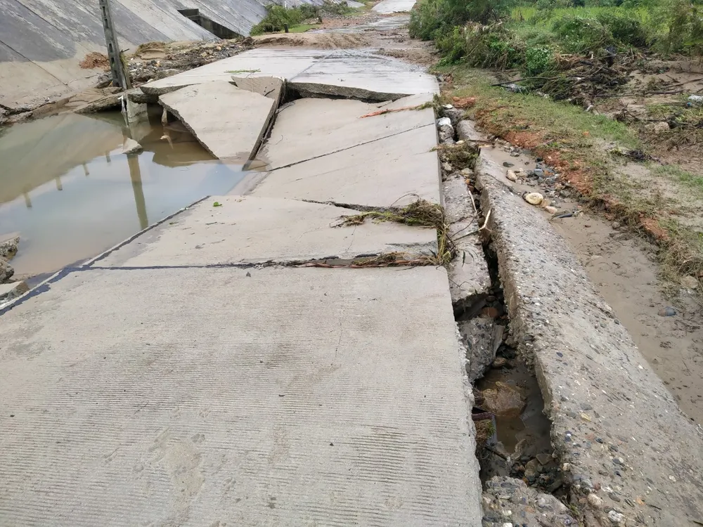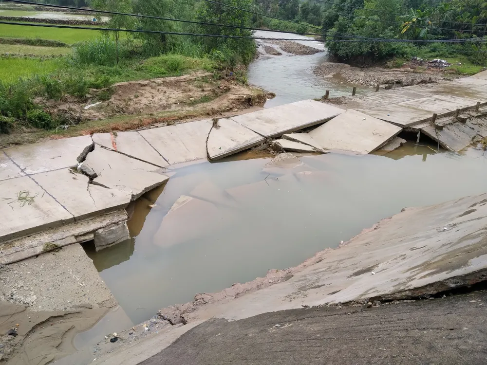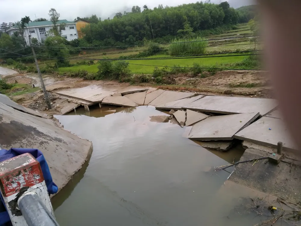 Cầu tràn suối Hy Long, xã Ba Điền, mưa lớn làm sụt lún, đứt gãy 60m, đất đá tràn lấp đường, không lưu thông được do nước chảy xiết.
