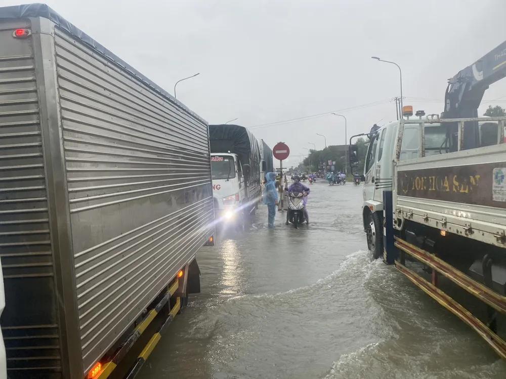 Đến trưa cùng ngày, mưa lớn gây ngập cục bộ Quốc lộ 1A đoạn qua xã Tịnh Phong, TP Quảng Ngãi, gây ách tắc giao thông. Do có đoạn nước ngập sâu hơn 1m nên nhiều xe máy của công nhân tan làm không thể qua lại được, phải đi bộ trở về.