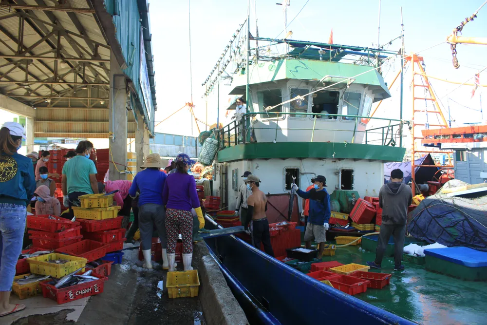 Trong sáng 21-9, các xe đông lạnh đã vào cảng để vận chuyển toàn bộ hải sản của tàu ông Bé. Ông Bé nói: “Tàu tôi khai thác 20 tấn hải sản, do dịch Covid-19, giá cá các loại khoảng 15.000-16.000 đồng/kg, tính ra thì không lời nhưng vừa cập cảng bán xong cá thì rất mừng”.