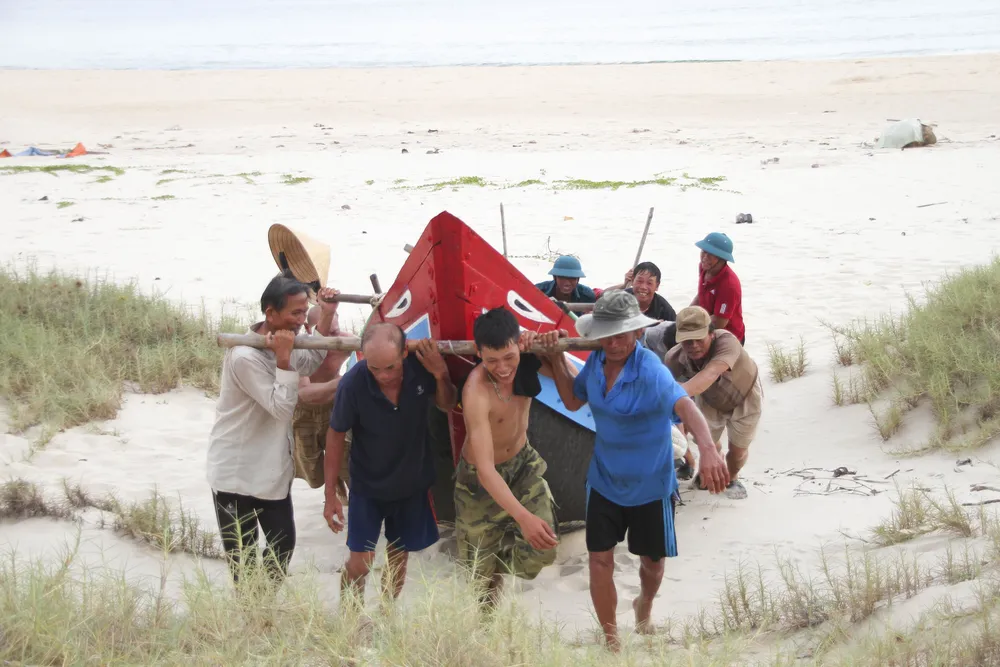 Ngư dân vùng bãi ngang cùng phụ giúp nhau đem thuyên lên khu vực bãi cát cao để đảm bảo an toàn.