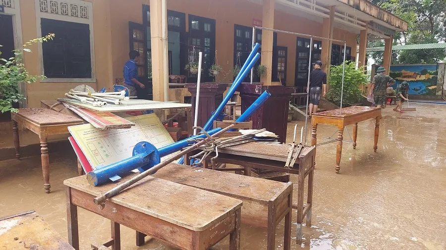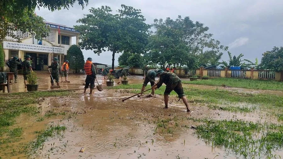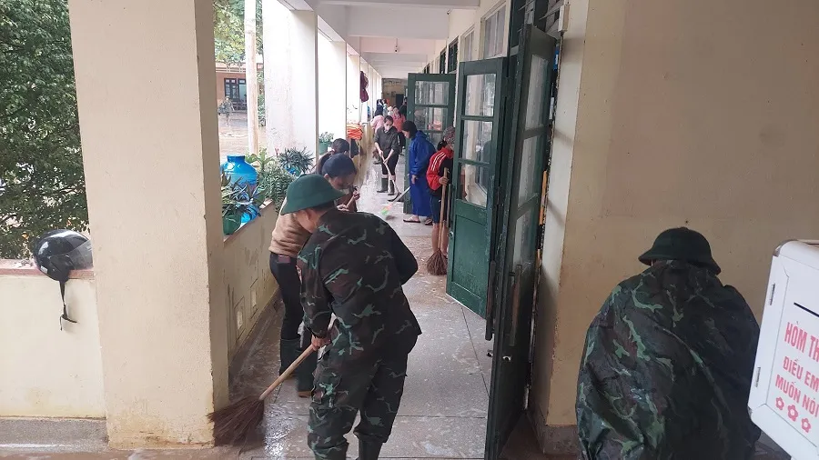 Trưa 14-11, mưa ngớt hạt, lũ sông Hiếu rút nên 50 cán bộ, chiến sĩ Trung đoàn 19 đã hành quân đến các Trường Tiểu học và THCS Cam Tuyền (xã Cam Tuyền, huyện Cam Lộ, tỉnh Quảng Trị) cùng giáo viên và các phụ huynh thu dọn đồ đạc, vệ sinh trường lớp để sớm đón học sinh đi học trở lại.