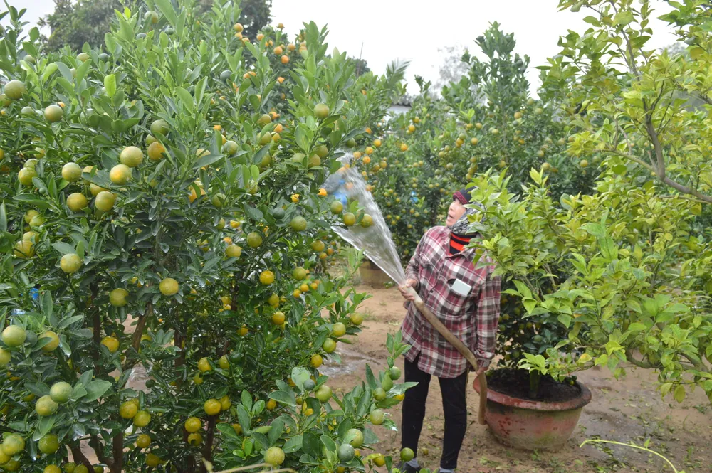 Chủ vườn tăng cường thuê nhân công thường xuyên túc trực chăm sóc, tưới nước, bón phân, bơm thuốc cho cây quất giữ đến ngày xuất bãi