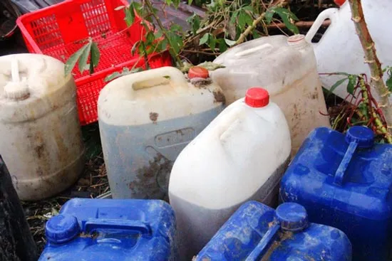 Rất nhiều thùng nhựa chứa hóa chất còn lại ở hiện trường sau khi vụ nổ.