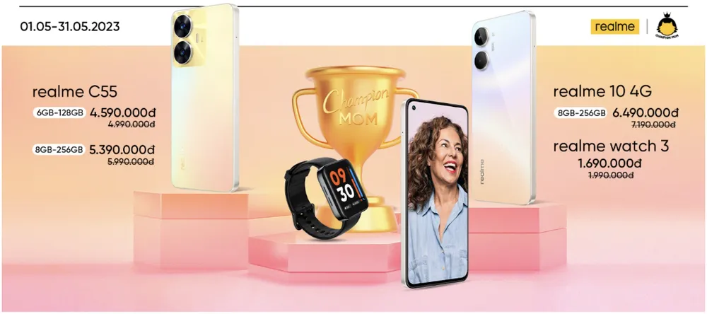 Dịp này realme cũng tung chương trình ưu đãi xuyên suốt tháng 5 khi mua điện thoại thuộc dòng C, realme 9 series, realme 10 và nhiều sản phẩm công nghệ khác tại toàn bộ chuỗi bán lẻ trên toàn quốc...
