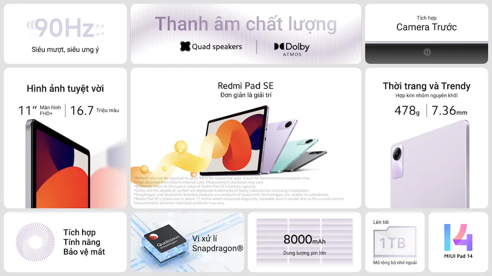 Redmi Pad SE có khả năng tái tạo 16,7 triệu màu, bao phủ nhiều màu sắc sống động trong phổ màu mà mắt người có thể nhìn thấy, khiến mọi nội dung đều trở nên sống động. Với tốc độ làm mới lên tới 90Hz, thiết bị mang đến trải nghiệm mượt mà...