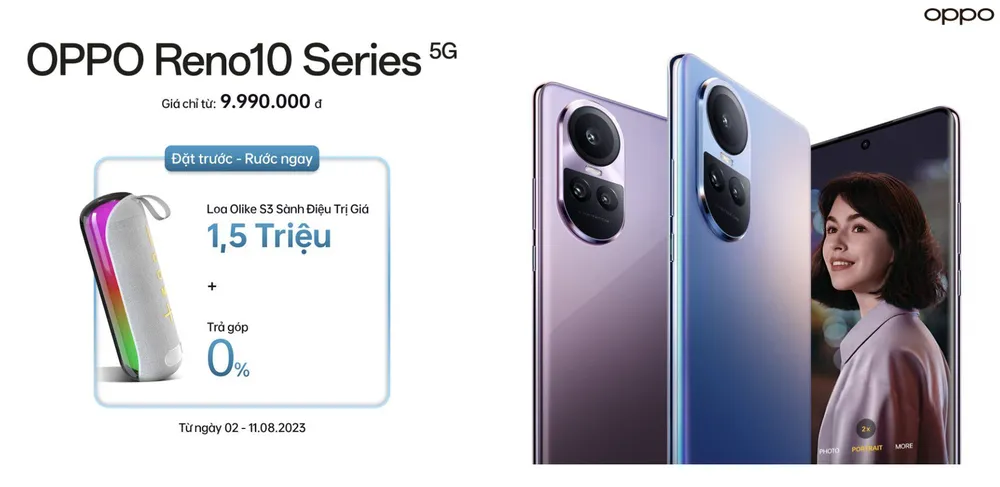 OPPO cũng ưu đãi người dùng, từ ngày 2-8-2023 đến hết ngày 11-8-2023, khi đặt trước Reno10 Series, người dùng sẽ nhận được các ưu đãi đặc biệt gồm loa bluetooth Olike S3 sành điệu trị giá 1.500.000 đồng, trả góp 0%.