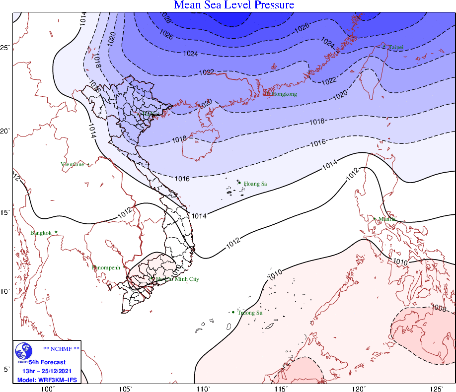 Dự báo tới khoảng ngày 25-12, bộ phận không khí lạnh mạnh này sẽ bắt đầu ảnh hưởng đến vùng núi phía Bắc của Bắc bộ, sau đó ảnh hưởng đến các nơi khác ở Bắc bộ, Bắc Trung bộ và Trung Trung bộ. Do cường độ mạnh nên đợt này, một số nơi ở Nam Trung bộ cũng bị ảnh hưởng, dự báo nền nhiệt độ giảm, có mưa dông.