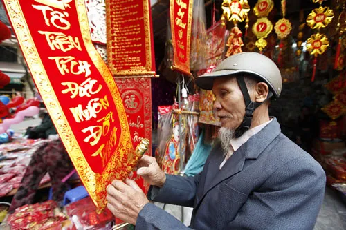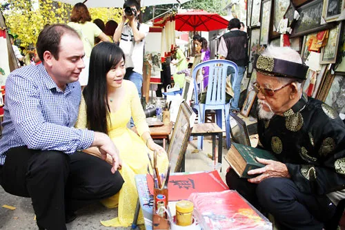 Người nước ngoài thăm phố ông đồ ở chợ hoa công viên Tao Đàn