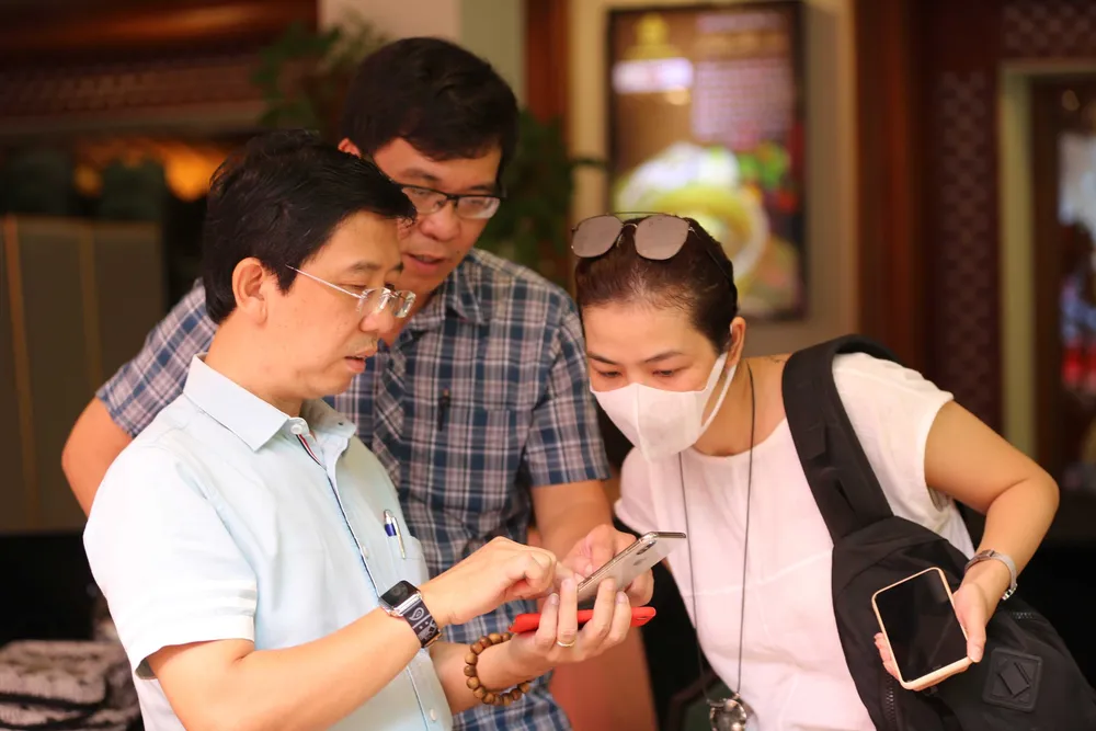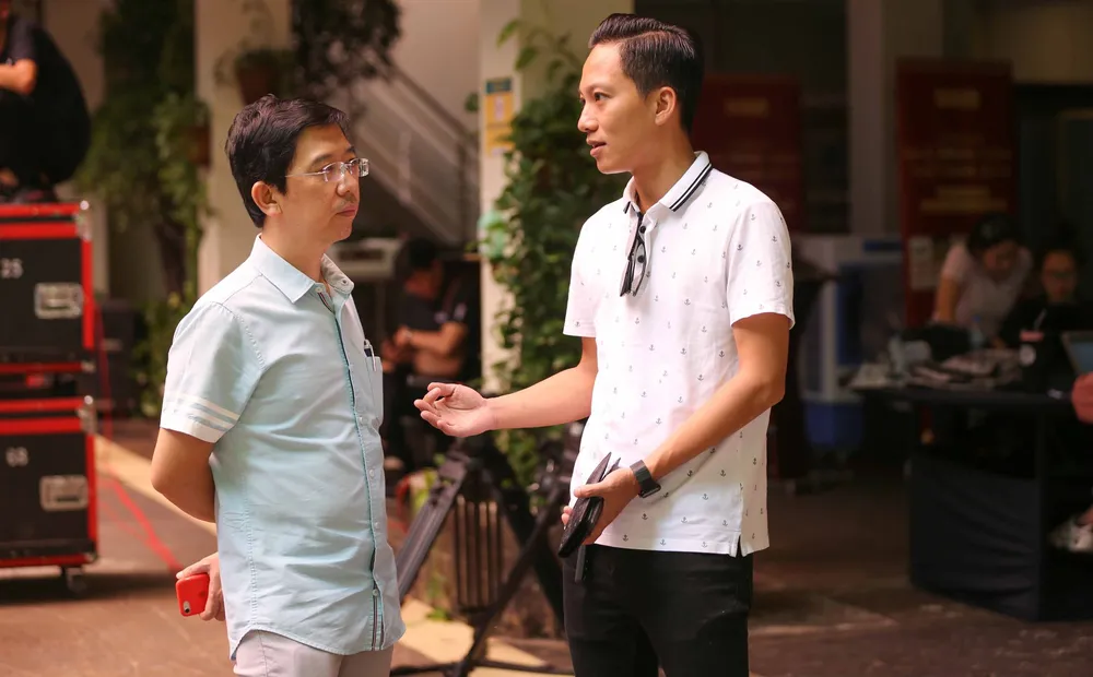 Ông Nguyễn Nhật, Phó Tổng biên tập Báo Sài Gòn Giải Phóng, Trưởng ban Tổ chức Lễ trao giải Quả Bóng vàng 2019 trao đổi với MC Nguyên Khang và diễn viên Vân Trang trước giờ G. Ảnh: DŨNG PHƯƠNG
