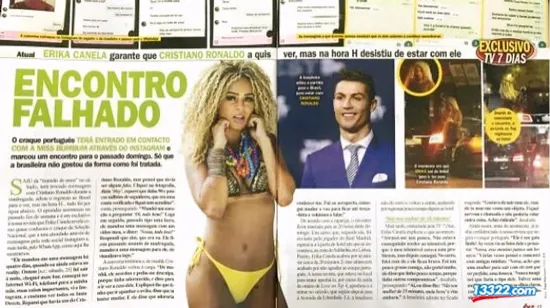 Các tin nhắn này đang được báo chí Bồ Đào Nha đăng tải và đang được điều tra tính xác thực. CR7 thuyết phục được Erika hoãn chuyến bay trở lại Brazil vào tối 26-3. Anh phái một chiếc taxi đến khách sạn ở Lisbon đón Erika kèm tin nhắn mời cô về nhà mình “tâm sự”. Erika không thể lên xe đúng hẹn do điện thoại của cô bất ngờ bị trục trặc. Phải đợi một lúc sau, khi điện thoại hoạt động bình thường trở lại, cô mới liên lạc tiếp được với Ronaldo. Cũng chính vì sự trễ hẹn đó nên buổi hẹn hò đã không diễn ra thành công. Siêu sao người Bồ tức phát điên trong khi người đẹp sợ rằng Ronaldo chỉ xem mình là trò giải trí như nhiều cô gái khác. Erika kể: “Cristiano ca thán chuyện tôi trễ hẹn. Anh ấy nói rằng thời gian đối với mình rất quý giá. Sau khi hẹn gặp tôi, anh ấy còn bận trăm công ngàn việc nữa. Tôi nhận ra Cristiano chỉ coi tôi như món đồ chơi giải trí trong chốc lát. Tôi bảo với anh ấy rằng tôi không phải thứ đàn bà đến chỉ để mua vui cho anh trong 15 phút hay nửa tiếng. Tôi trở lại khách sạn luôn và không còn hẹn gặp anh ấy nữa”.