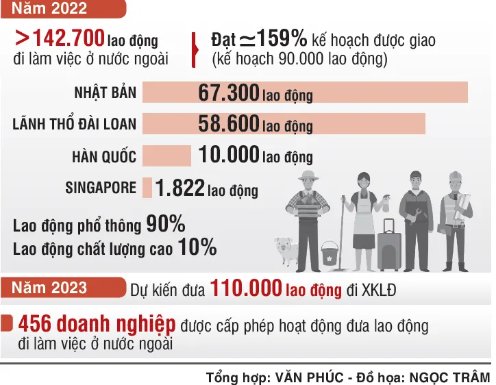 Theo Thứ trưởng Bộ LĐTB-XH Nguyễn Bá Hoan, để thực hiện được mục tiêu năm 2023, cần tiếp tục giữ ổn định thị trường lao động truyền thống, từng bước mở rộng đối với những thị trường mới. Điểm quan trọng là cần khắc phục khó khăn, tháo gỡ vướng mắc về chính sách, tạo các thủ tục thông thoáng, đẩy mạnh dịch vụ công trực tuyến, đảm bảo hỗ trợ tốt cho NLĐ đi làm việc ở nước ngoài, phải đào tạo để thúc đẩy xuất khẩu lao động chất lượng cao, có tay nghề, có trình độ. Theo thống kê, hiện nay 90% lao động đi làm việc ở nước ngoài vẫn là lao động phổ thông. Phân khúc lao động chất lượng cao mới chỉ chiếm khoảng 10%.