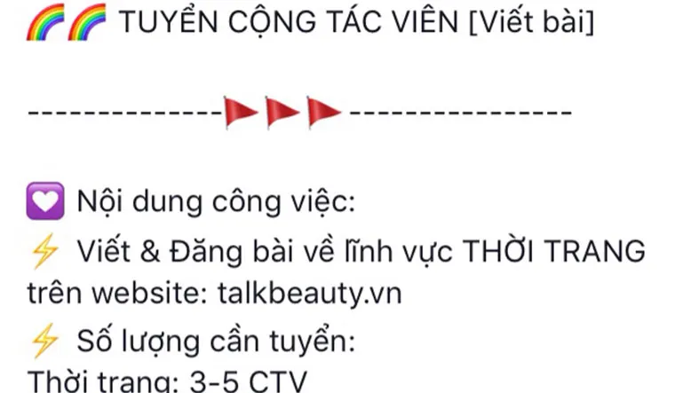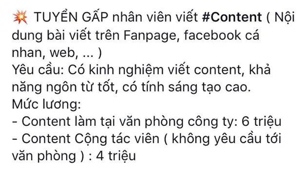 Chỉ cần gõ từ khóa “viết content” trên mạng xã hội hay các trang web tìm việc online, có đến cả ngàn tuyển dụng với nội dung: “Viết content tại nhà”, “Viết content pr fanpage”, “Viết content mỹ phẩm”… Đa phần các công việc viết content được người đăng tin giới thiệu khá dễ và nhẹ nhàng như: “Viết content chuẩn SEO nội dung y tế, sức khỏe. Công việc thích hợp cho những bạn không có xe và muốn làm việc tại nhà”, “Cần tuyển cộng tác viên viết content. Làm việc tại nhà, thời gian linh hoạt, chỉ cần đáp ứng đủ mỗi ngày 2 bài. Việc làm thích hợp cho các bạn sinh viên, không có phương tiện đi lại, làm việc tại nhà. Lương thỏa thuận”… Người đăng tin để lại mail và số điện thoại để người ứng tuyển liên lạc hoặc nhắn tin trao đổi qua mạng xã hội. Chủ yếu là sự đồng thuận từ hai bên và hoàn toàn không có bất cứ hợp đồng lao động, hay hợp đồng thử việc nào được ký kết.