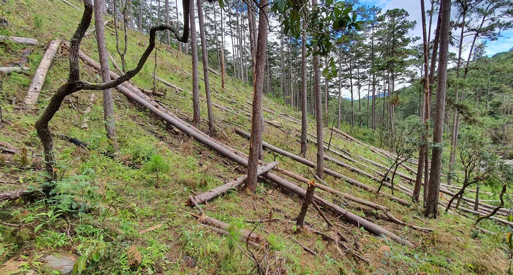 Thông bị đốn hạ nằm tầng tầng lớp lớp. Ảnh: ĐOÀN KIÊN