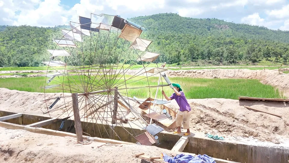 Tương tự, khu ruộng của ông Đinh Nêm dù có kênh mương đi qua nhưng cũng khô khát. Ông Đinh Nêm nảy sinh ý tưởng dùng guồng quay nước đặt tại kênh dẫn để bơm nước lên ruộng.