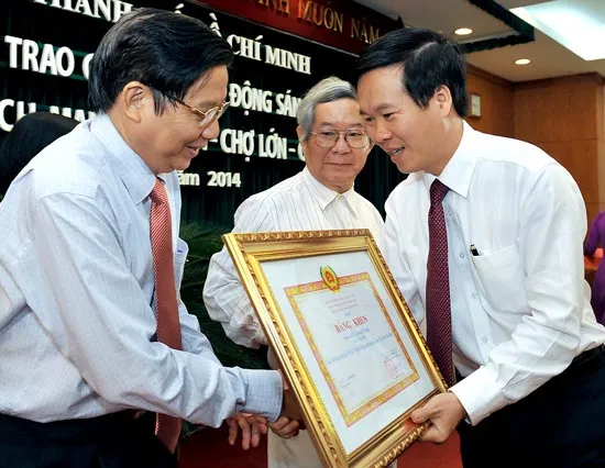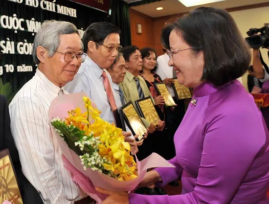 Phó Bí thư Thường trực Thành ủy TPHCM Võ Văn Thưởng tặng bằng khen cho các tác giả đoạt giải ba. Ảnh: VIỆT DŨNG