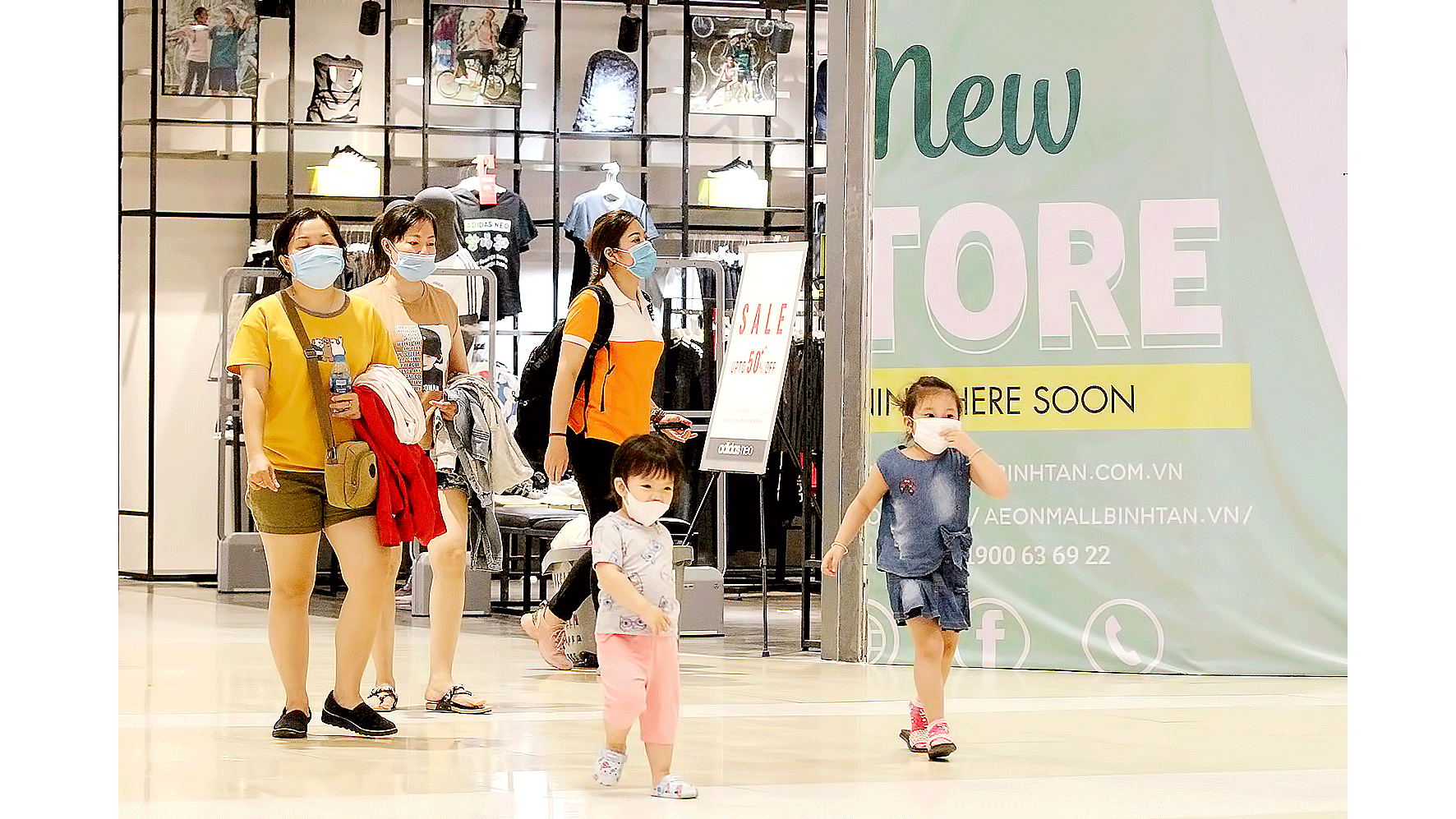 Cả nhà đeo khẩu trang ở nơi công cộng. Ảnh: HOÀNG HÙNG