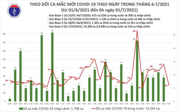 * Tính từ 18 giờ 30 ngày 30-6 đến 6 giờ ngày 1-7 có 189 ca mắc mới (BN16864 - BN17052) ghi nhận trong nước gồm: TPHCM (158), Tiền Giang (16), Phú Yên (8 ), Hưng Yên (6), Vĩnh Long (1); trong đó, 188 ca được phát hiện trong khu cách ly hoặc khu đã được phong tỏa.
