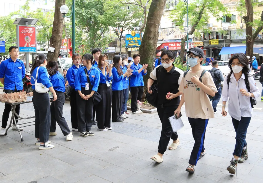 | Thí sinh làm thủ tục dự thi được lực lượng tình nguyện hỗ trợ tối đa, tại Trường THPT Việt Đức, Hà Nội, chiều 27-6. Ảnh: VIẾT CHUNG |