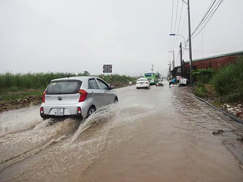 Sáng nay, mưa lớn và triều cường gây ngập một số tuyến đường như Lương Định Của (quận 2), đường Huỳnh Tấn Phát (quận 7), đường Đỗ Xuân Hợp (quận 9).
