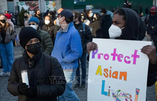 Người dân tham gia tuần hành phản đối bạo lực nhằm vào người gốc Á, sau vụ xả súng tại Atlanta, ở New York, Mỹ, ngày 19-3-2021. Ảnh: THX/TTXVN