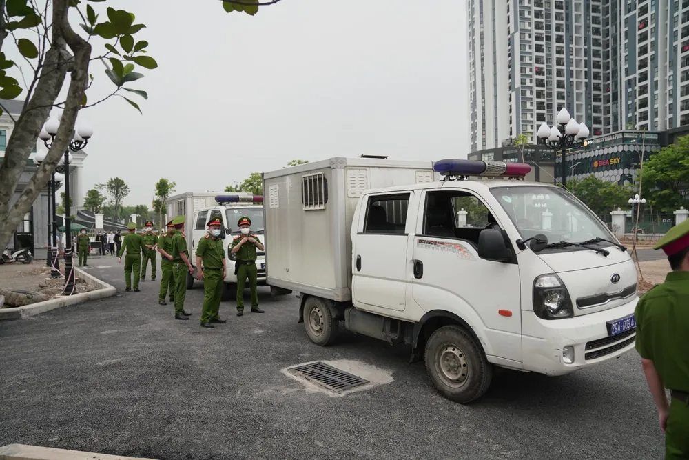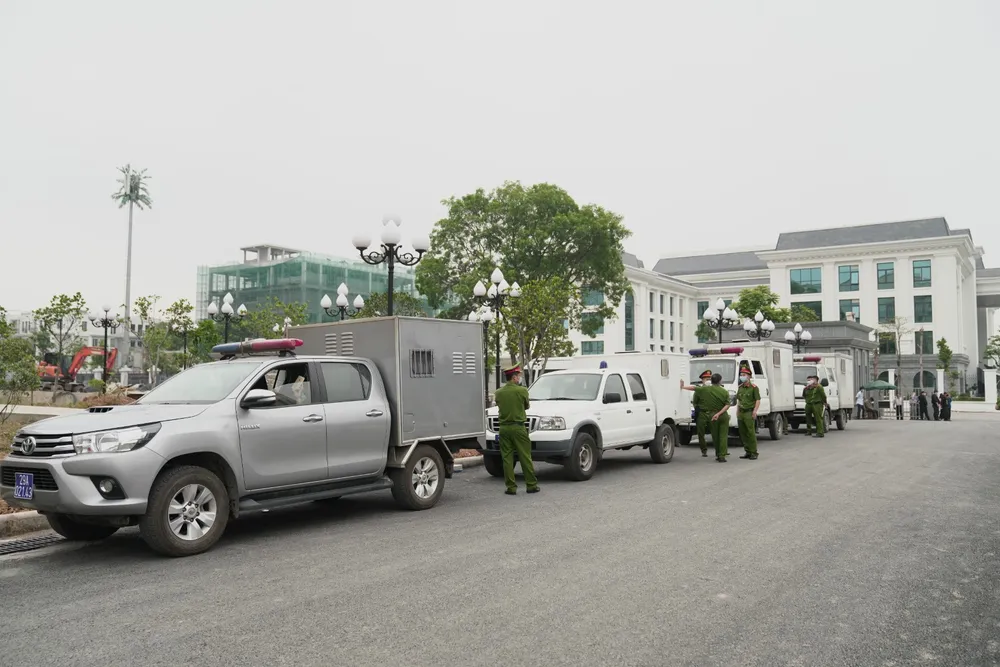 Gần 7 giờ, đoàn xe đưa các bị cáo tới tòa