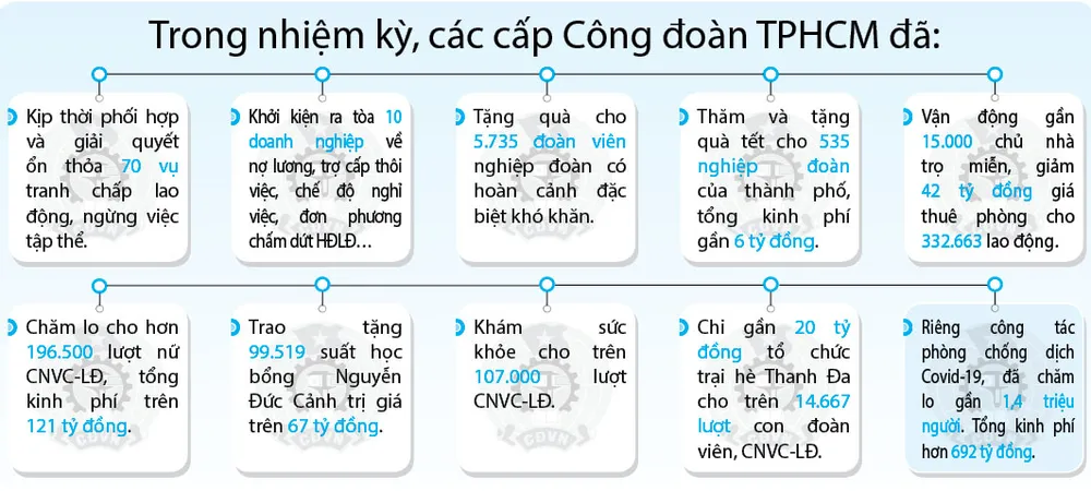 Trong nhiệm kỳ qua, Công đoàn TPHCM đã tổ chức 1.549 lớp tập huấn cho 162.589 lượt cán bộ công đoàn. Các lớp tập huấn, đào tạo về kỹ năng phát triển đoàn viên, thành lập công đoàn cơ sở, kỹ năng đối thoại, thương lượng, nghiệp vụ tài chính, kế toán, kiểm tra, tư vấn pháp luật, giải quyết tranh chấp lao động, đình công, kỹ năng trình bày, thiết kế các sản phẩm tuyên truyền; kỹ năng viết tin, bài; kỹ năng đối thoại… liên tục được tổ chức.
