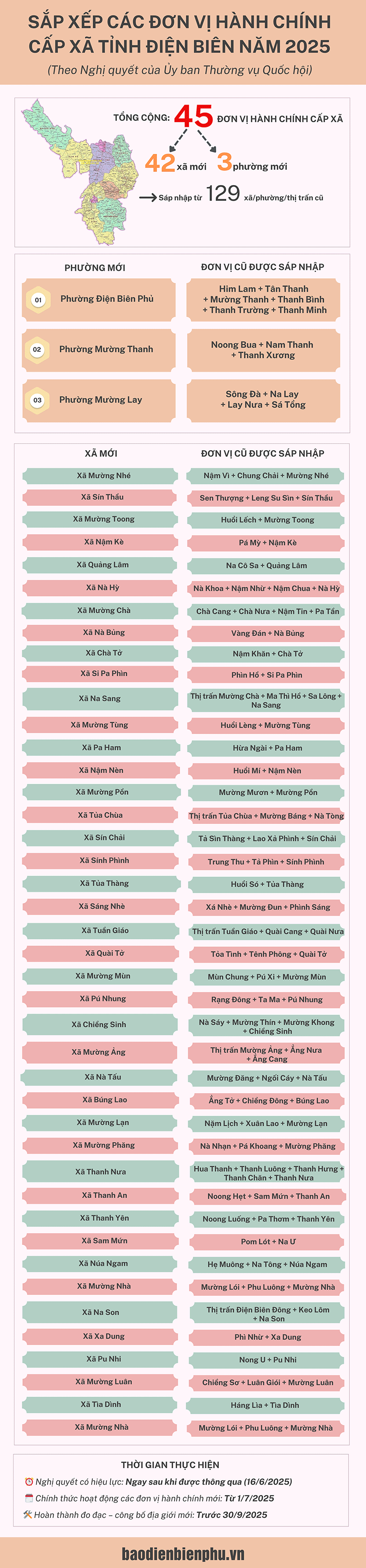 Ngày 16-6-2025, Ủy ban Thường vụ Quốc hội khóa XV đã thông qua Nghị quyết số 1661/NQ-UBTVQH15 về việc sắp xếp các đơn vị hành chính cấp xã của tỉnh Điện Biên. Đây là một trong 34 nghị quyết được Chủ tịch Quốc hội Trần Thanh Mẫn ký ban hành nhằm thực hiện chủ trương sắp xếp đơn vị hành chính cấp xã tại 34 tỉnh, thành phố. Theo đó, tỉnh Điện Biên tiến hành sắp xếp 129 đơn vị cấp xã, hình thành 45 đơn vị mới.