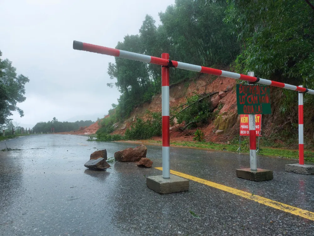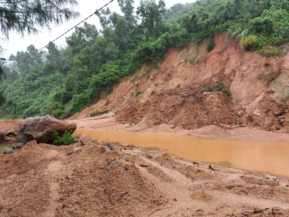 Cách đó khoảng 3km về phía ven biển, trên tuyến đường Quốc phòng ven biển đi qua địa bàn thôn 1, xã Cẩm Lĩnh (huyện Cẩm Xuyên) vào xã Kỳ Xuân (huyện Kỳ Anh), cũng do ảnh hưởng mưa lớn kéo dài đã khiến nhiều khối đất đá trên vách núi cao bị sạt lở, đổ ập xuống nghiêm trọng, gây ách tắc giao thông.
