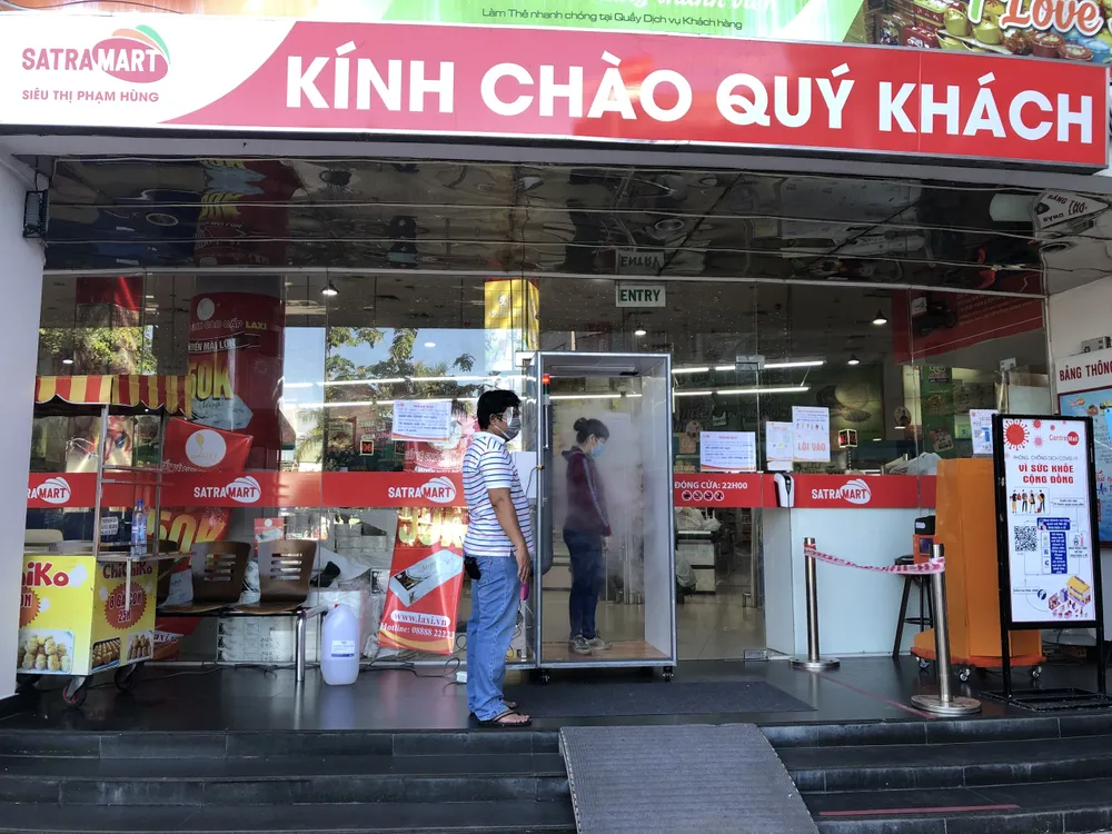 Khách hàng được khử khuẩn trước khi vào siêu thị để an toàn mua sắm