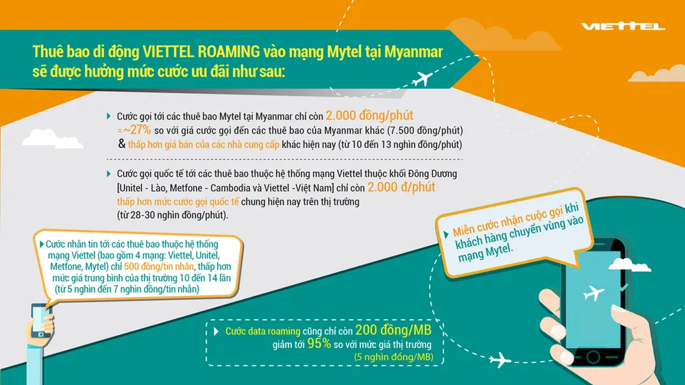 Thuê bao di động Viettel roaming vào mạng Mytel tại Myanmar sẽ được hưởng mức cước ưu đãi như sau: