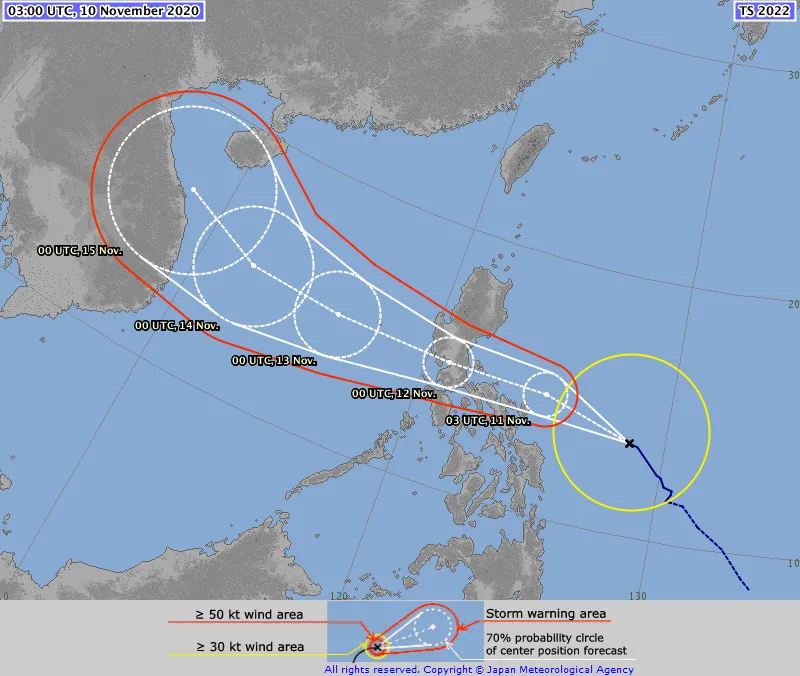 Trưa nay 10-11, tâm bão Vamco ở khoảng 13,5 độ vĩ Bắc – 128,6 độ kinh Đông. Cơn bão này di chuyển hướng Tây Tây Bắc, vận tốc 15km/giờ.
