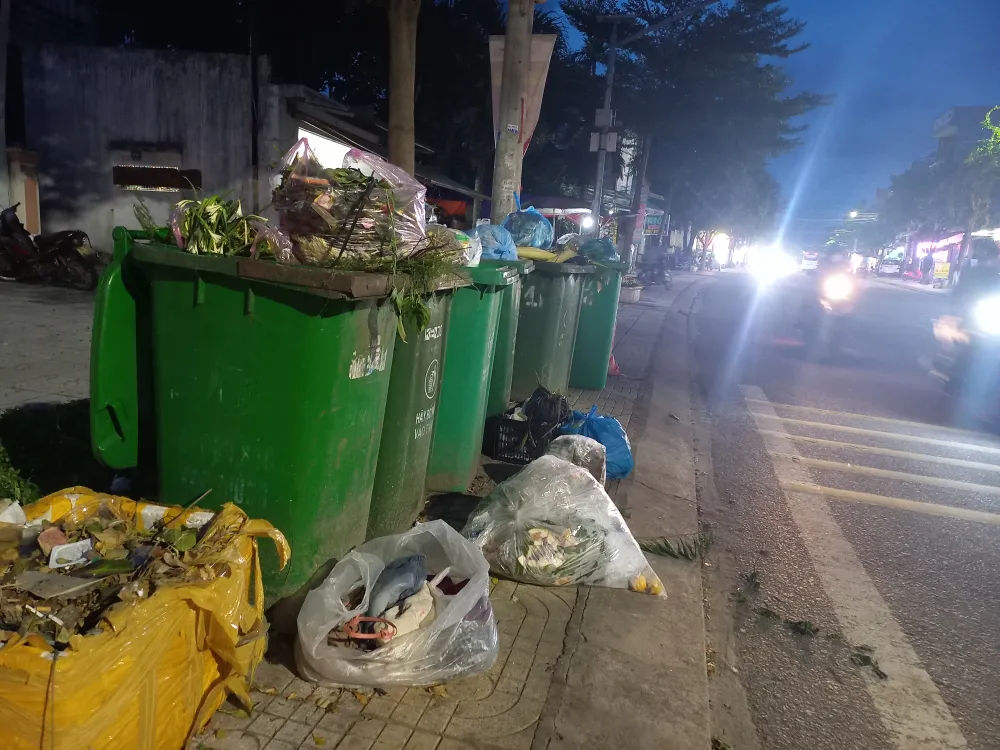 Những bịch rác để ngoài thùng chứa rác vào tối ngày 2-10 vì chưa được thu gom. Ảnh: NGUYỄN TRANG