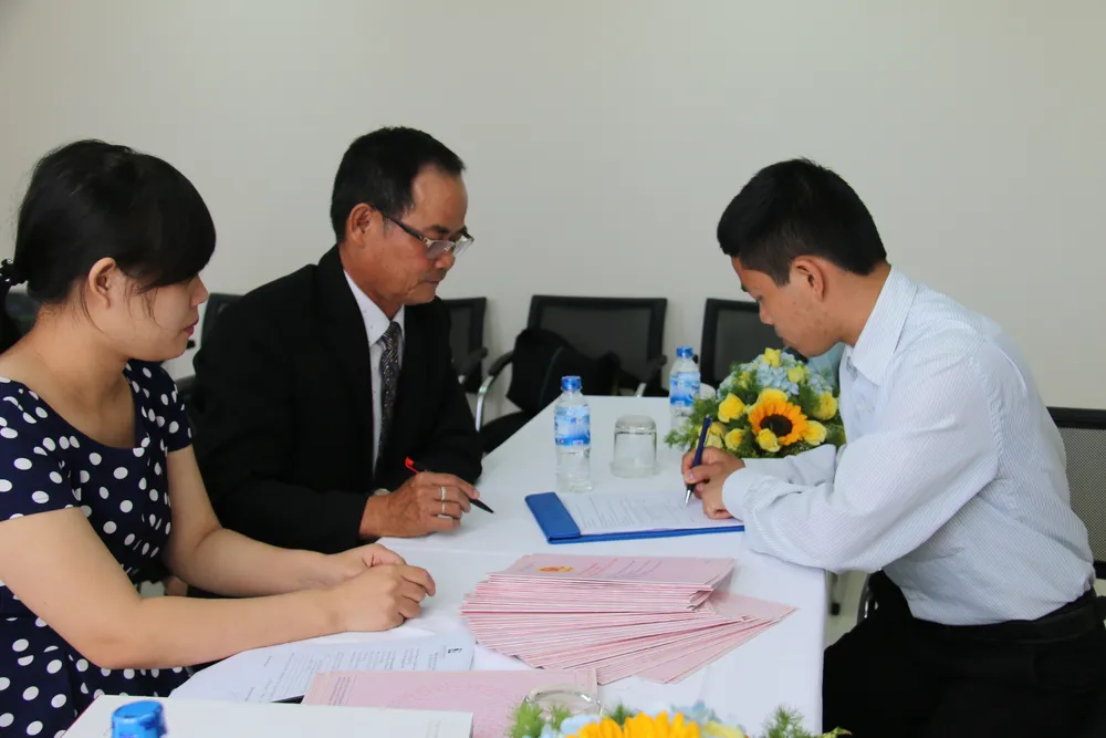 Đại diện VicoLand làm thủ tục bàn giao sổ hồng cho người dân
