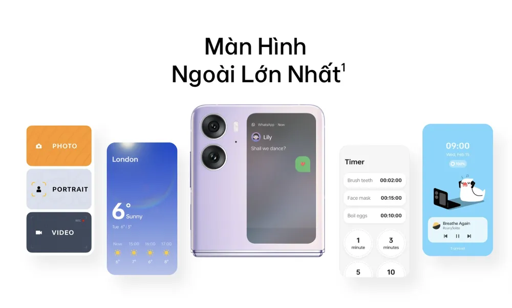 Là điện thoại gập dọc đầu tiên sở hữu màn hình ngoài lớn nhất tại thời điểm ra mắt, Find N2 Flip nổi bật với thiết kế gập cao cấp, sở hữu nếp gấp tàng hình, viên pin mạnh mẽ, thiết kế giao diện người dùng trực quan cùng với các cải tiến hàng đầu trong ngành.