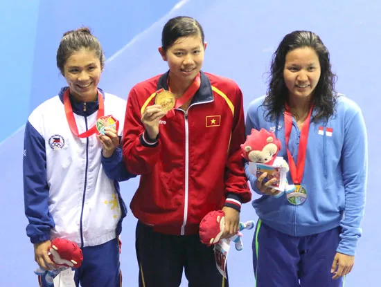 Nguyễn Thị Ánh Viên (giữa) đoạt HCV tại SEA Games 28.