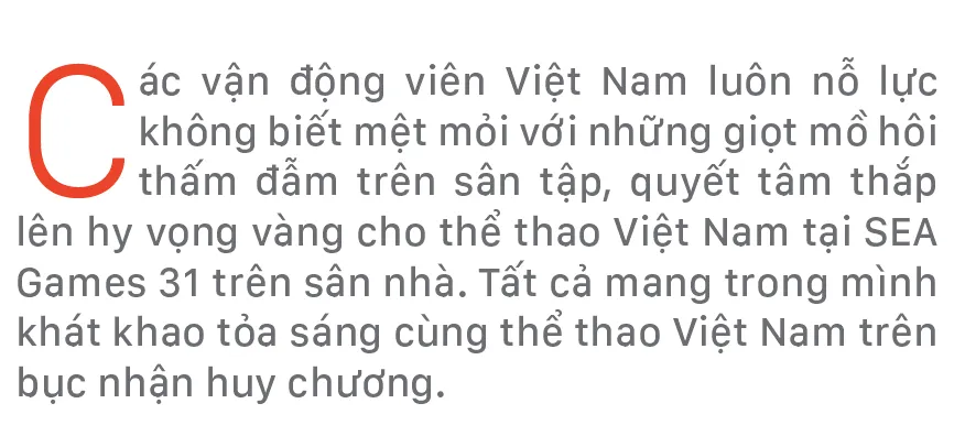 Các vận động viên Việt Nam luôn nỗ lực không biết mệt mỏi với những giọt mồ hôi thấm đẫm trên sân tập, quyết tâm thắp lên hy vọng vàng cho thể thao Việt Nam tại SEA Games 31 trên sân nhà. Tất cả mang trong mình khát khao tỏa sáng cùng thể thao Việt Nam trên bục nhận huy chương.