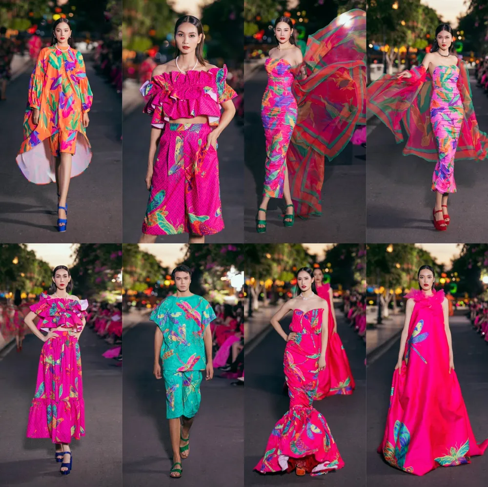 Ở phần 2 - họa tiết, siêu mẫu Minh Tú và Á hậu Kim Duyên xuất hiện từ phía bờ bên kia của dòng sông, catwalk trên sàn runway nổi. Bộ đôi mang đến thiết kế đầm ngắn chữ A, đính kết hoa lá, phối cùng boots da đầy cá tính.