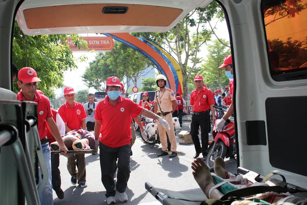 Đồng thời, ban tổ chức còn tổ chức thao diễn SCC tình huống tai nạn giao thông do tình nguyện viên SCC Hội Chữ thập đỏ TP Đà Nẵng thực hiện với tình huống giả định là: Mọi người đang tham gia giao thông trên đường, một ô tô đi tốc độ nhanh vào cua bị mất lái đã va chạm với 2 xe máy cùng chiều chở theo 2 người; 1 người bán hàng rong dắt xe đạp cùng 3 người khách đang mua hàng đã làm hàng loạt người ngã ra đường và bị thương.